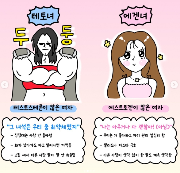 에겐 테토 유형은 에스트로겐(감성)과 테스토스테론(주도성)의 심리적 특성을 바탕으로, 성별과 결합해 총 네 가지로 나뉩니다.